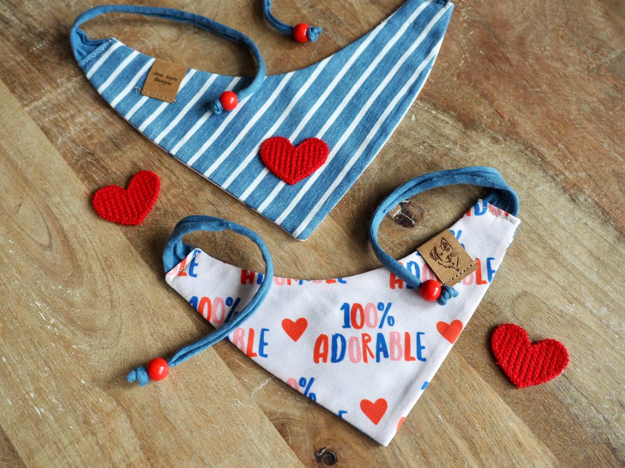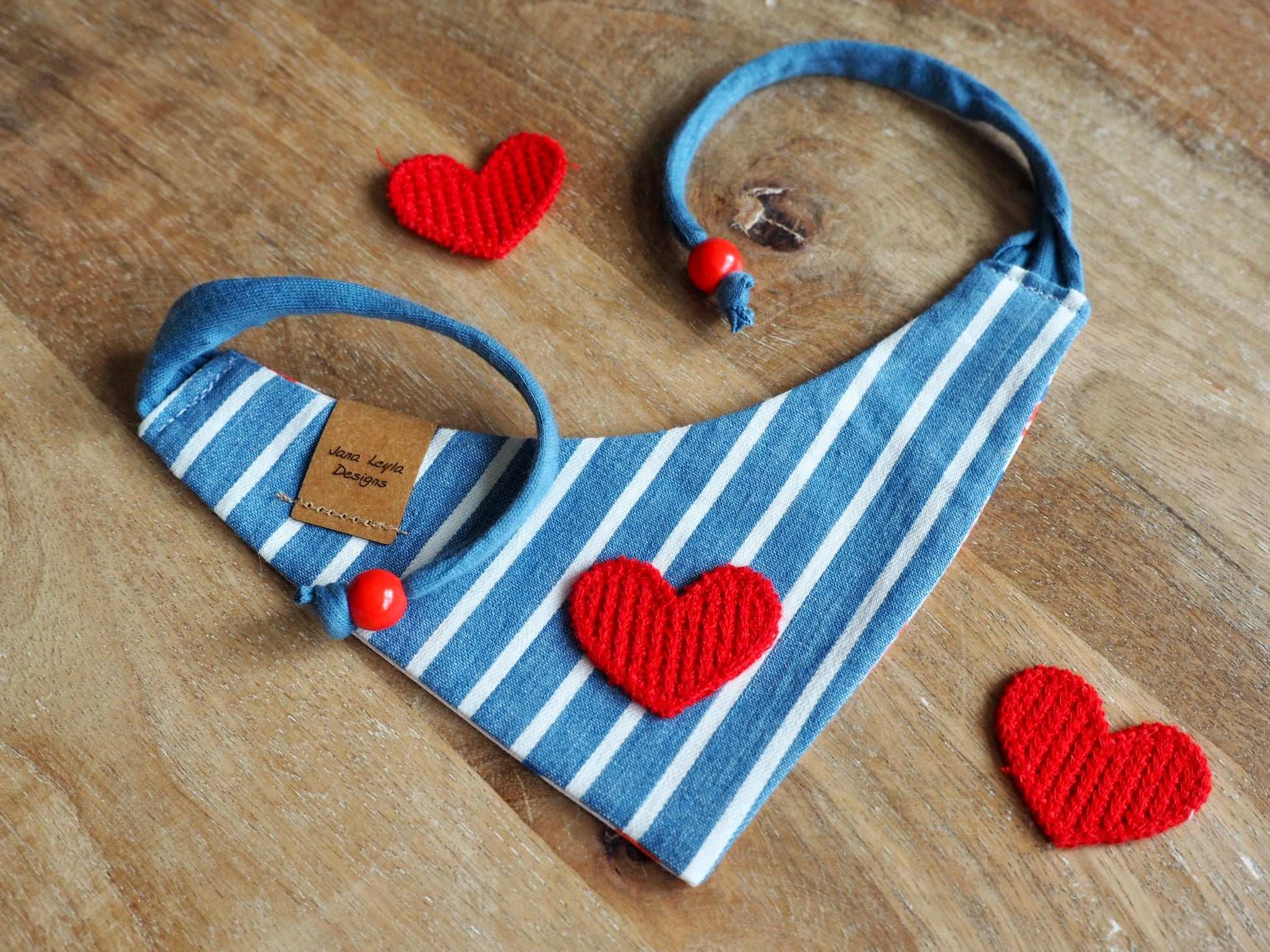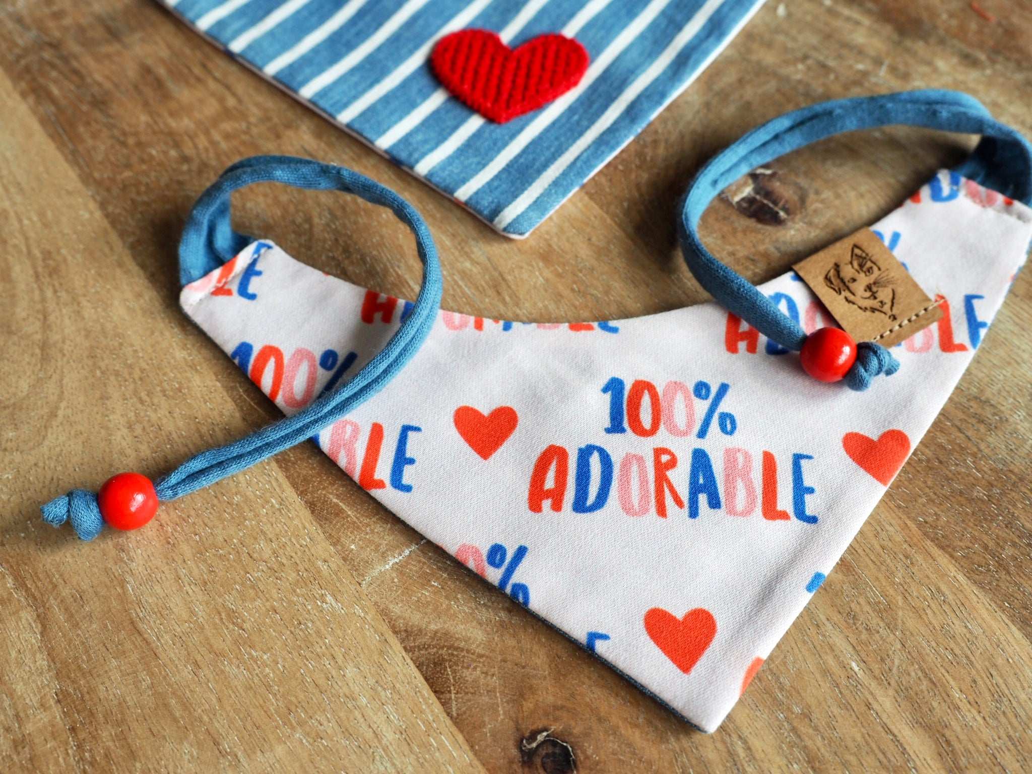 Almost all of our bandanas can be worn on both sides, so you can always switch between two great designs. In this case, you are spoiled for choice between a 100% adorable print and a striped back with a heart.
