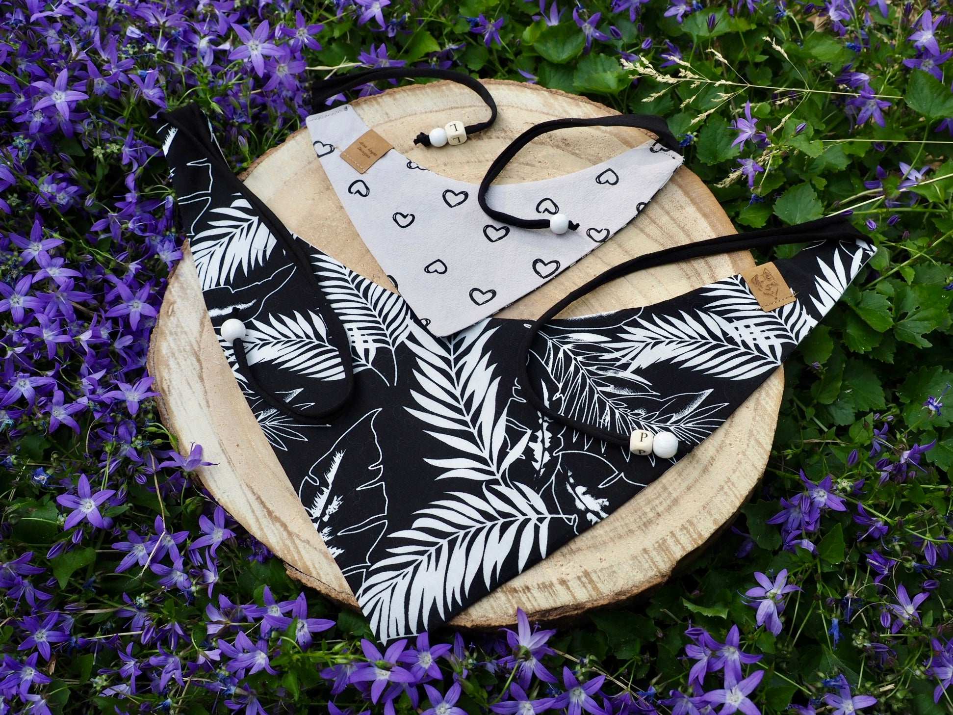 Almost all of our dog bandanas and cat bandanas can be worn on both sides, so you can switch between two great designs. In this case, you'll be spoiled for choice between the heart pattern and the palm tree print.