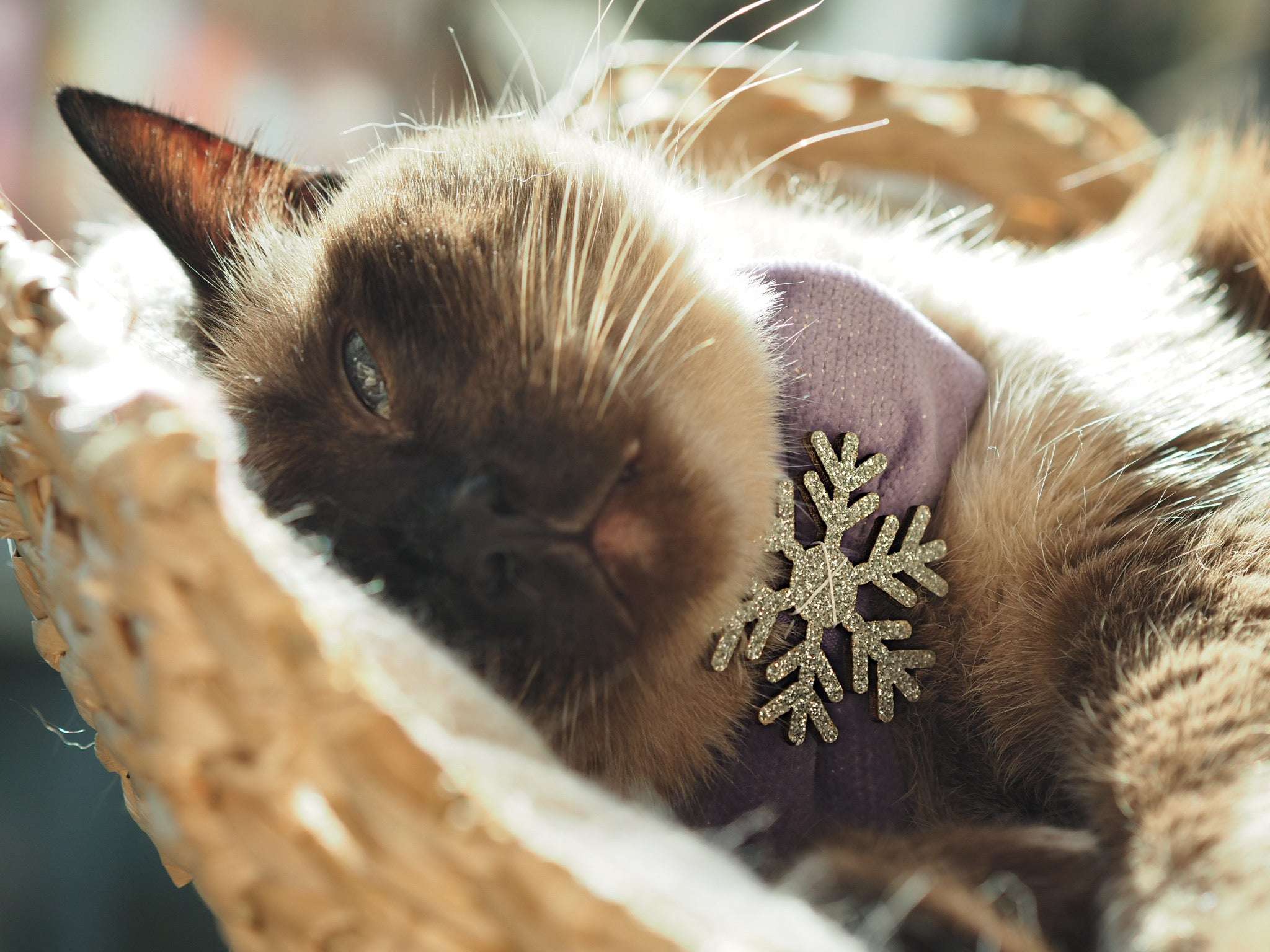 With the soft lilac fabric and the sparkling snowflake our "Love at frost sight" bow tie definitely invites for dreaming - perfectly shown by cat Perez :) the velvet paw wears a size S.