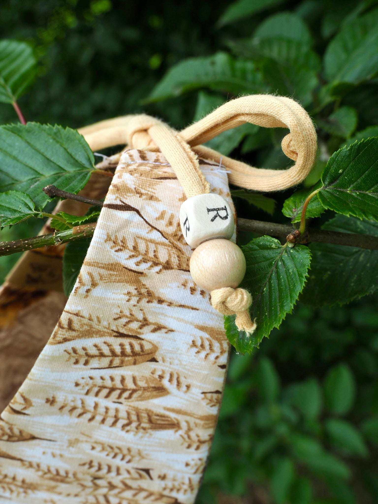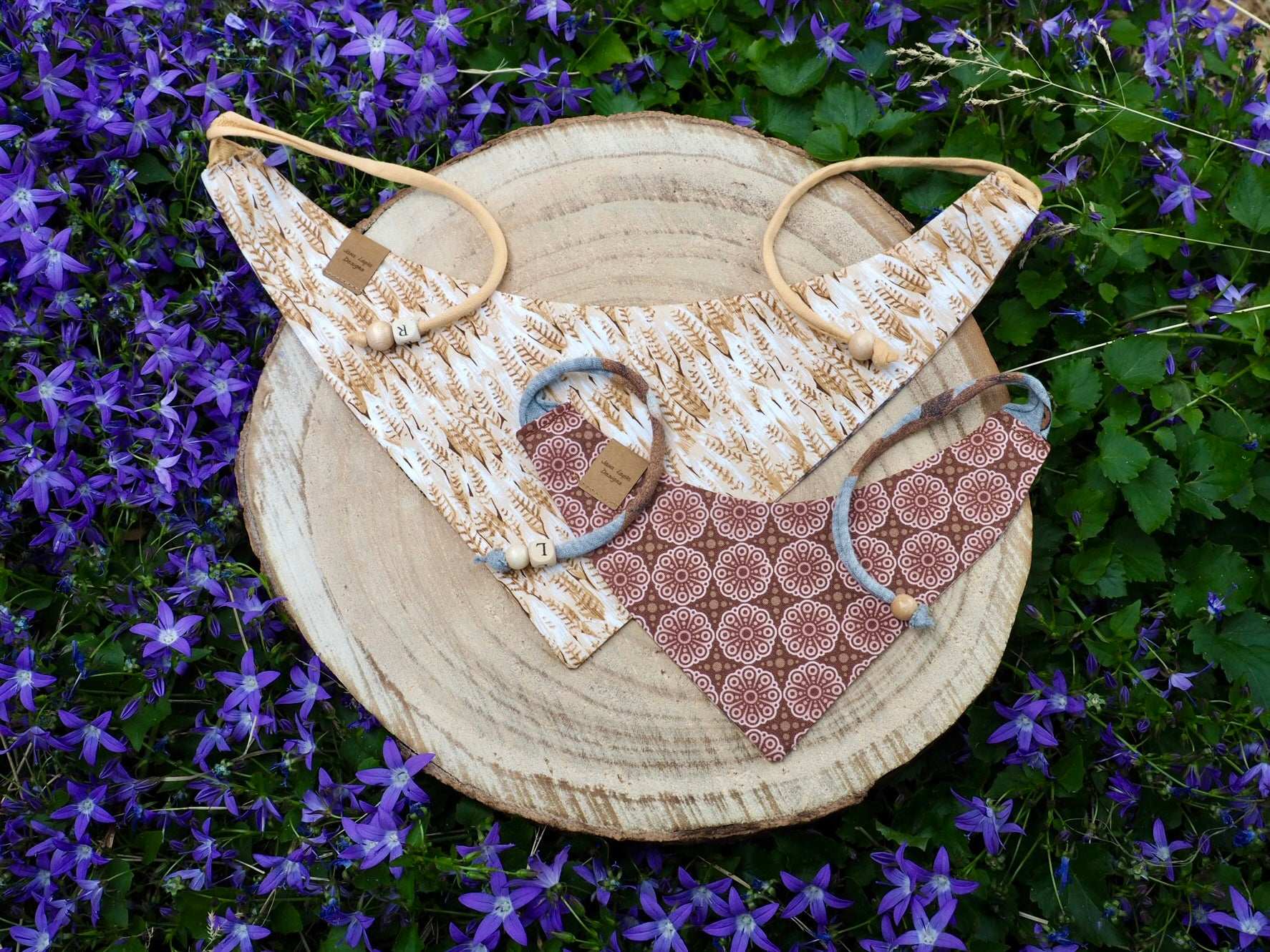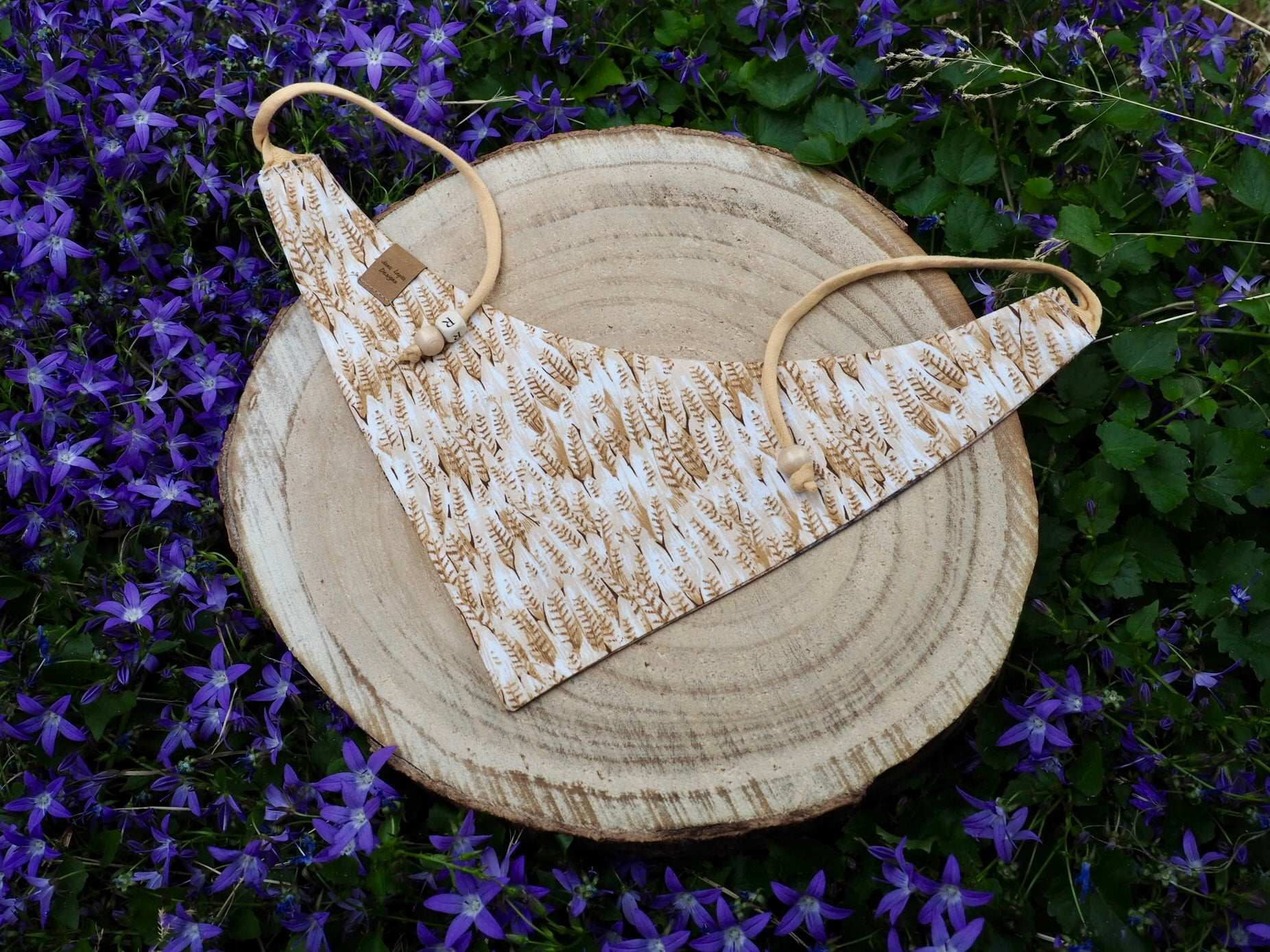 Material composition: 100% cotton, Ribbons: 100% recycled textile yarn plus wooden beads, label: 100% vegan leather substitute made from recycled paper and latex.