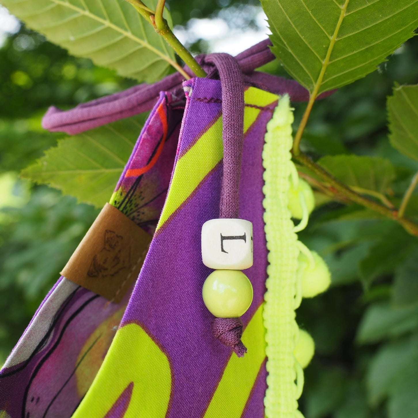 Material composition: 100% cotton; Ribbons: 100% recycled textile yarn plus wooden beads, label: 100% vegan leather substitute made from recycled paper and latex.