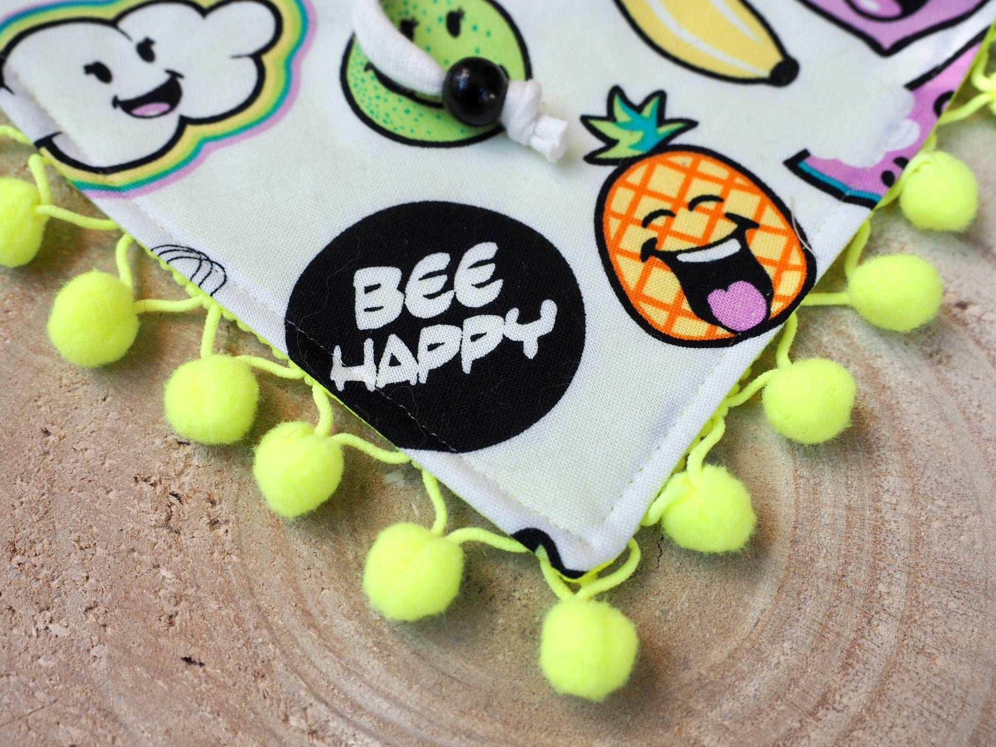 Like almost all of our dog bandanas and cat bandanas, this model can be worn on both sides. So whether you prefer the neon yellow side with the print or the cute smileys is entirely up to you...