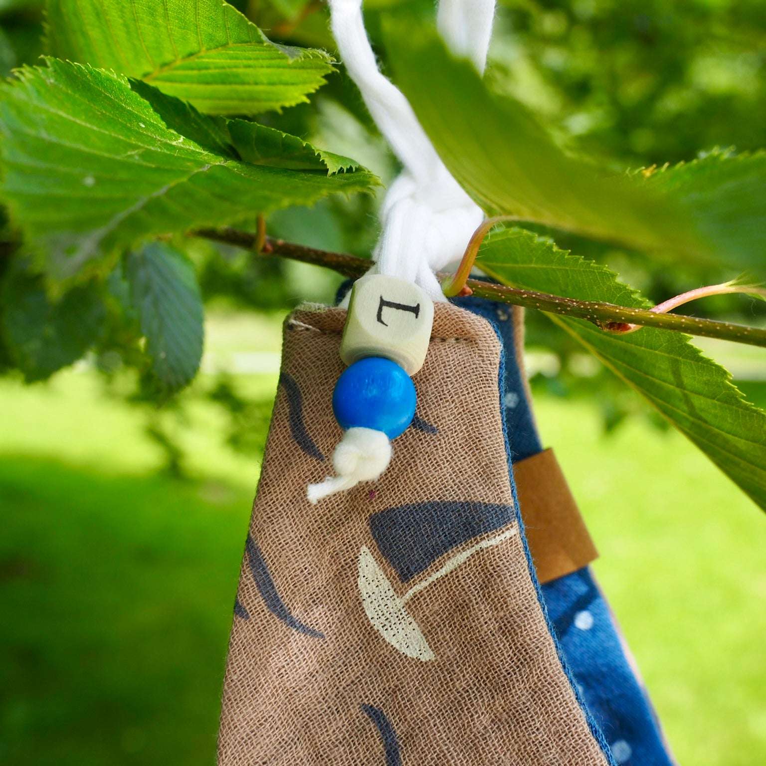Material composition: 100% Muslin; Ribbons: 100% recycled textile yarn plus wooden beads, label: 100% vegan leather substitute made from recycled paper and latex.