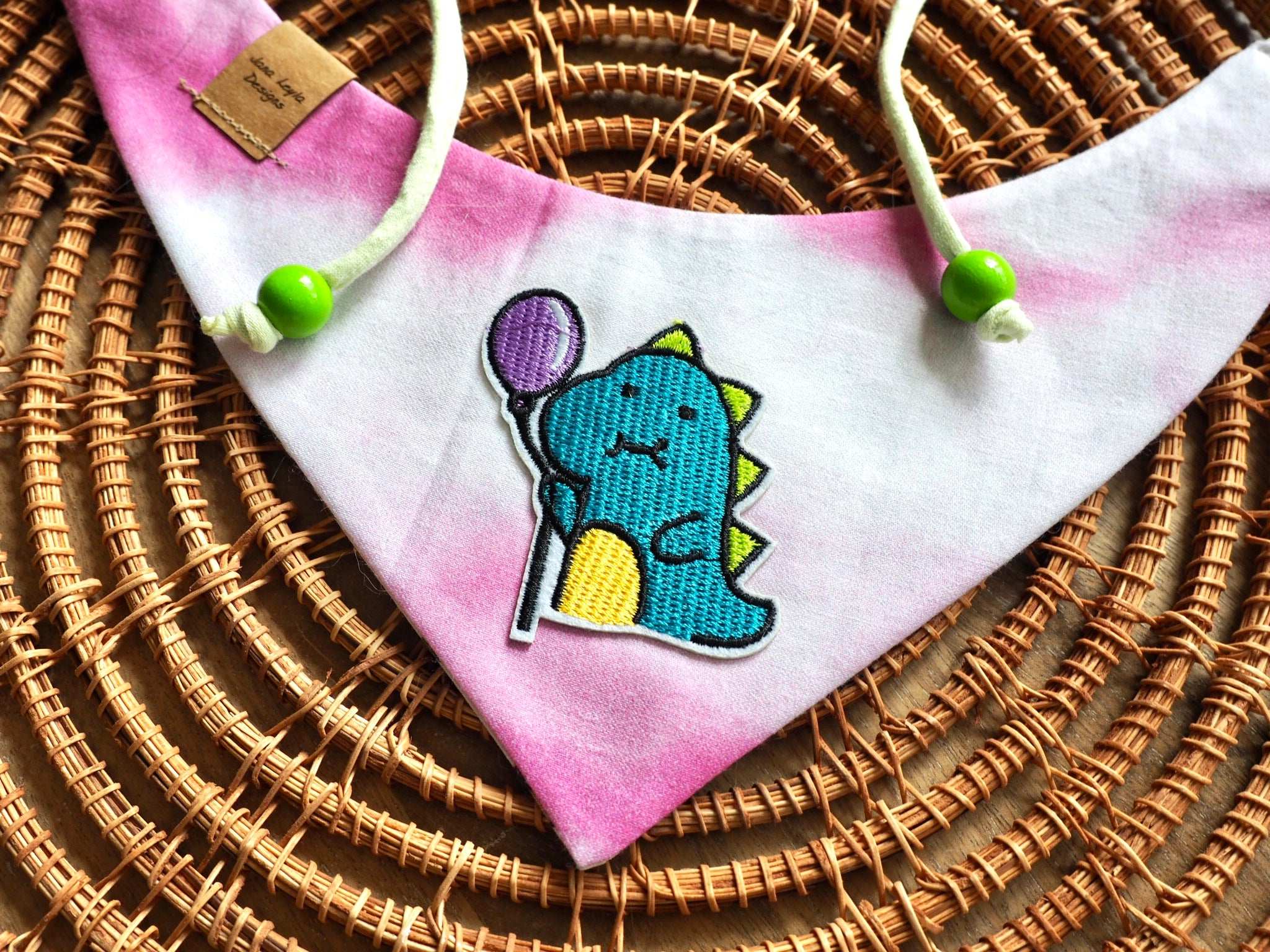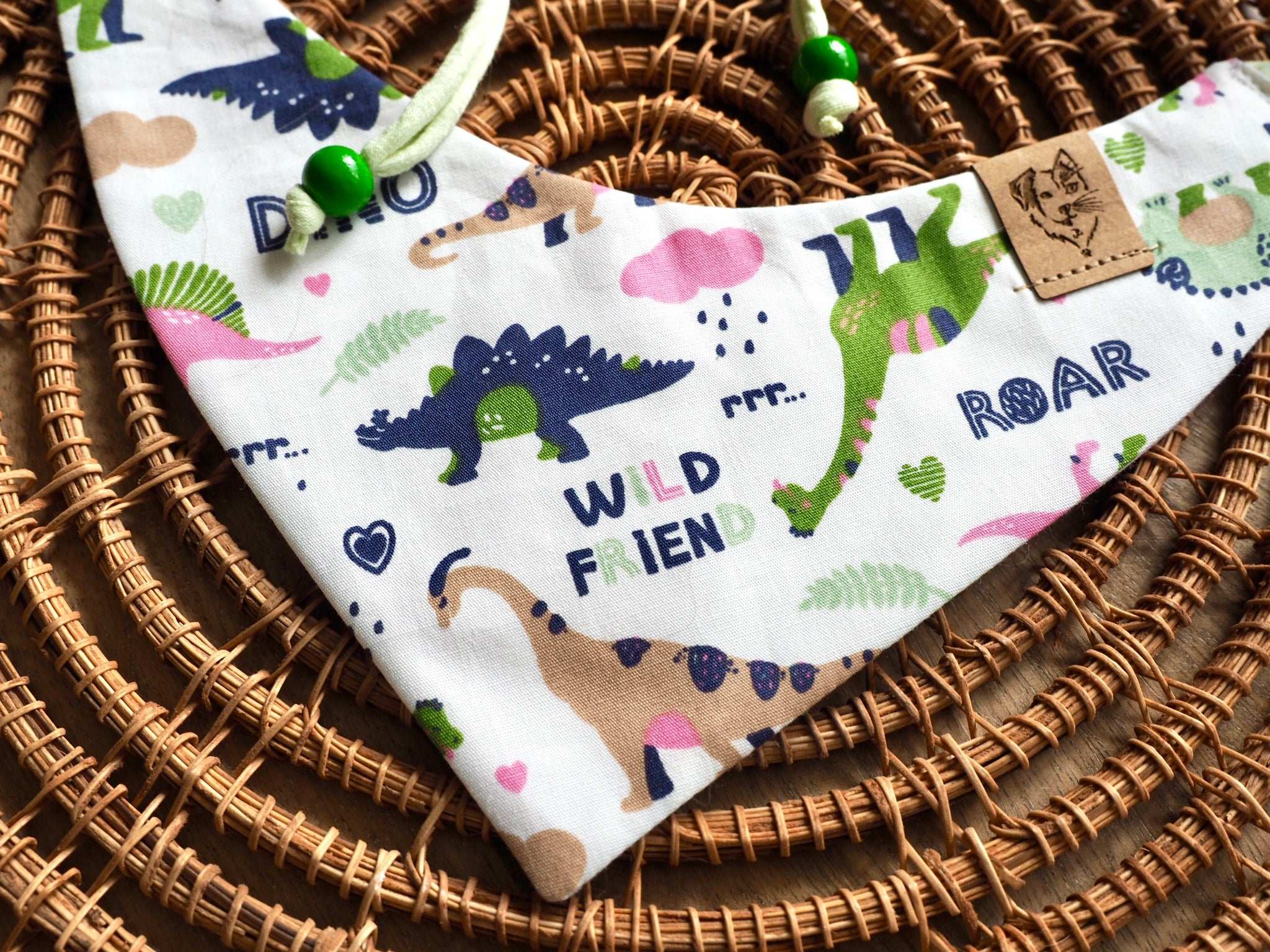 Almost all of our dog bandanas and cat bandanas can be worn on both sides, so you can always switch between two great designs. In this case, you'll be spoilt for choice between the Wild Friends pattern and the cute dinosaur patch :)