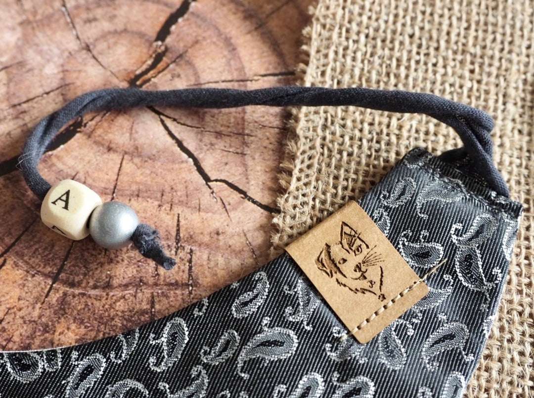 Material composition: 100% cotton (reverse side cotton flanell); Ribbons: 100% recycled textile yarn plus wooden beads, label: 100% vegan leather substitute made from recycled paper and latex.
