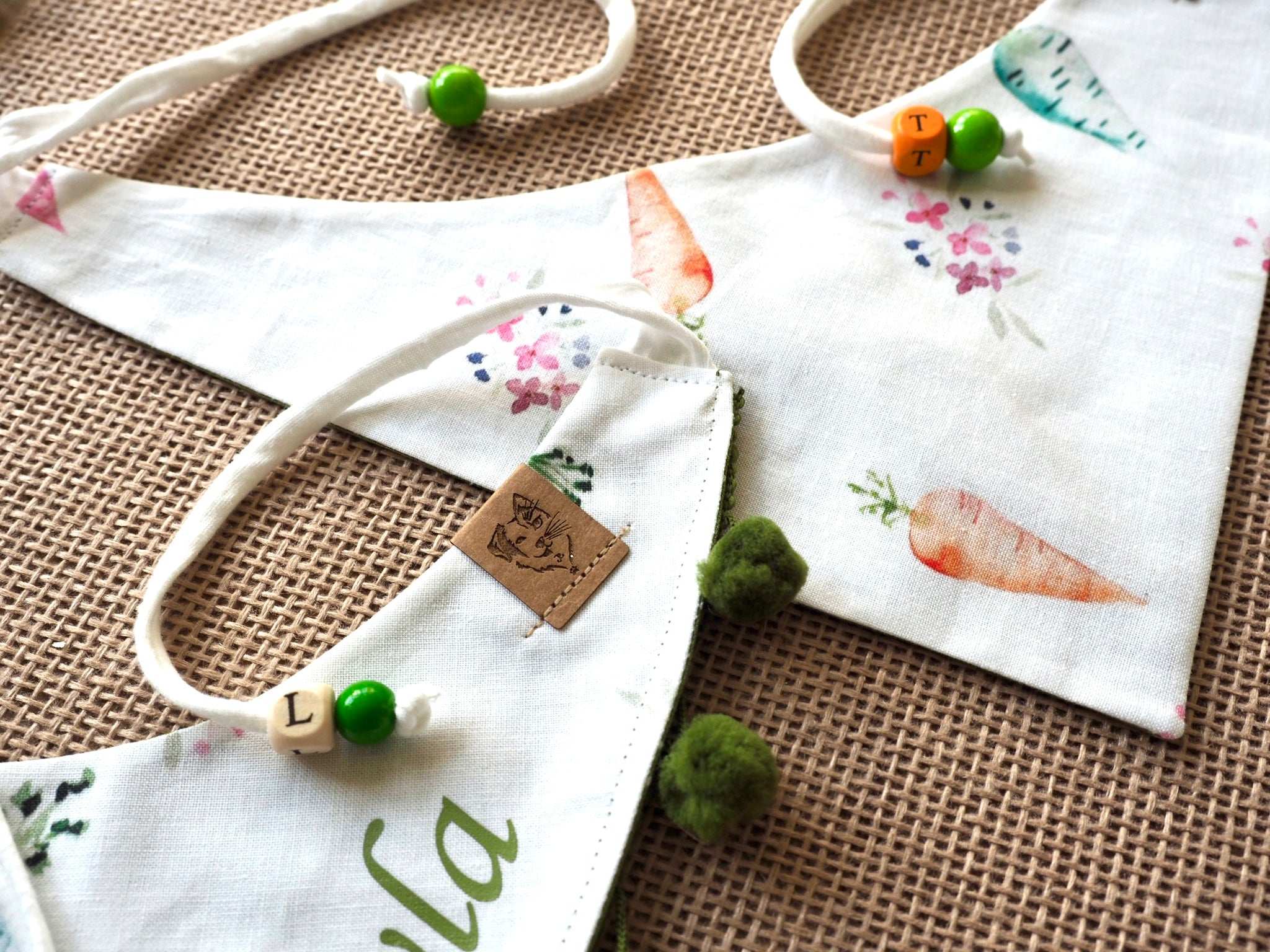 Material composition: 100% cotton; Ribbons: 100% recycled textile yarn plus wooden beads, label: 100% vegan leather substitute made from recycled paper and latex.