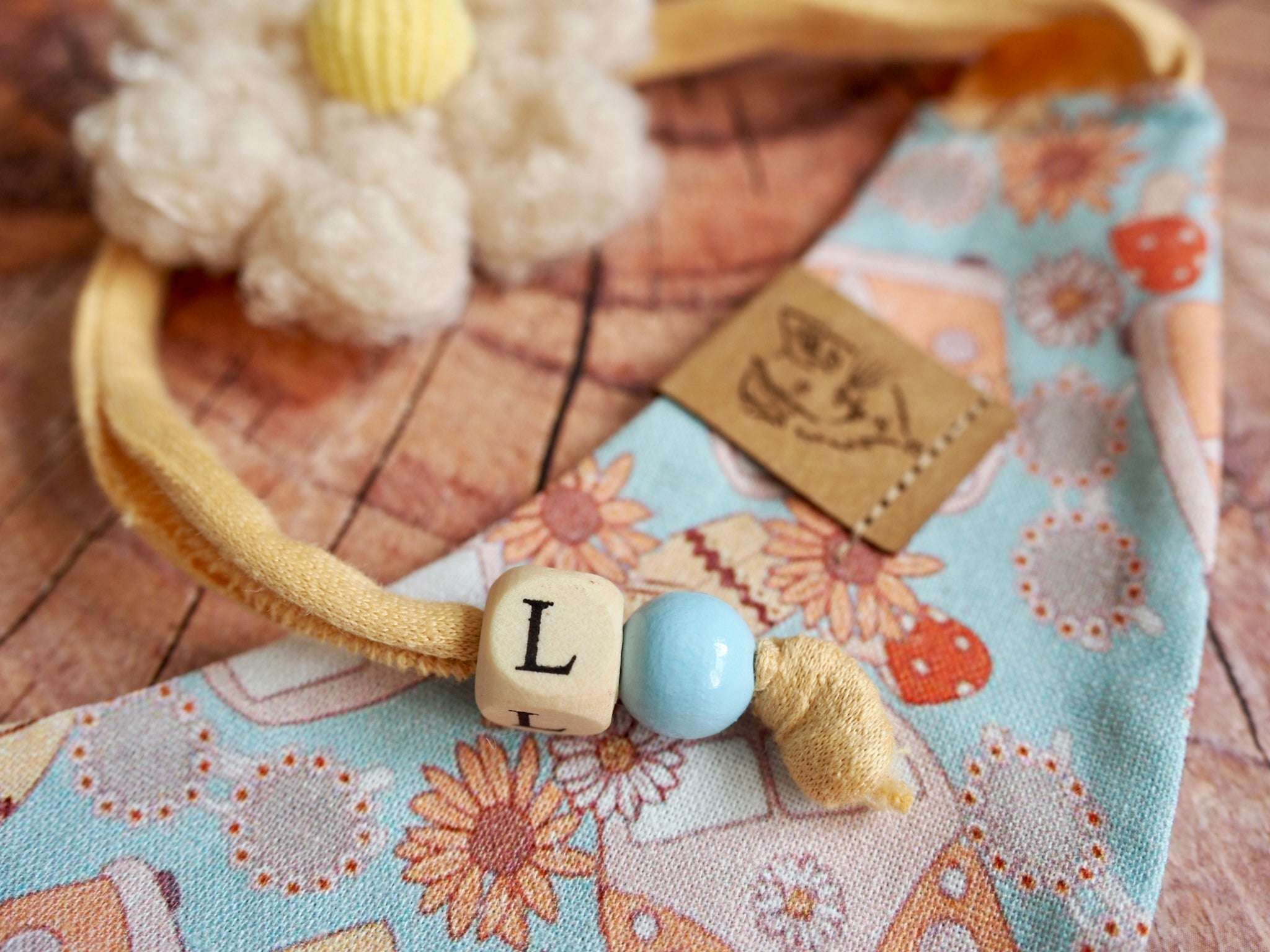 Material composition: 100% cotton; Ribbons: 100% recycled textile yarn plus wooden beads, label: 100% vegan leather substitute made from recycled paper and latex.